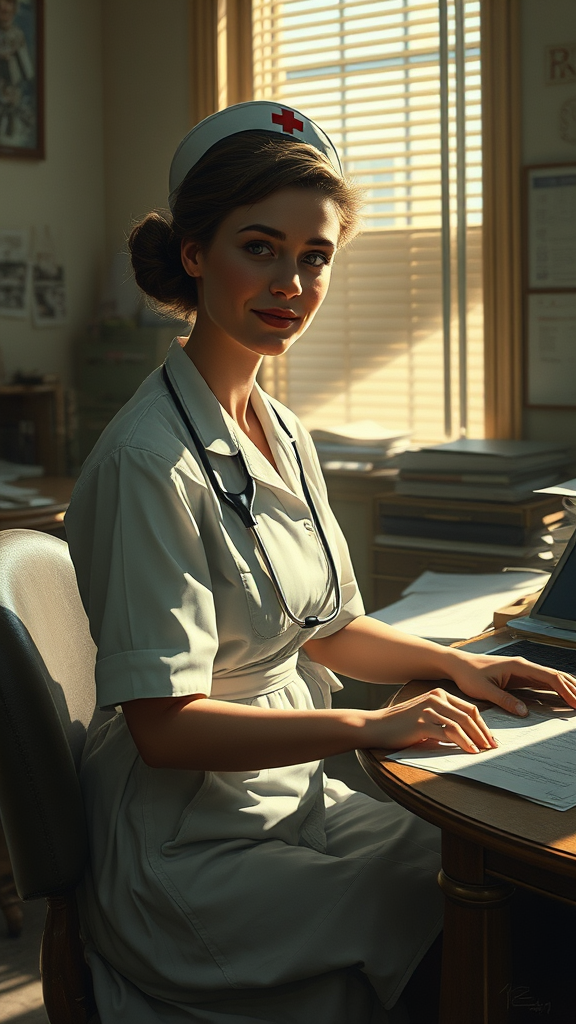 WWII nurse in an office, highly detailed, cinematic lighting, concept art, illustration, intricate details, masterpiece, hyper-realistic, digital painting, 8k, trending on ArtStation, inspired by Magali Villeneuve, Artgerm, Greg Manchess, Tom Bagshaw, and Jeremy Mann, with an air of vintage nostalgia, subtle sepia tones, reflections of daylight casting gentle shadows, a stethoscope casually draped over a chair, a soft breeze rustling papers on the desk, elements of surrealism with elongated limbs, composition fading into a dreamy haze, artful imperfections like an artist's signature blending seamlessly in the corner, evoking a sense of serenity amidst chaos.