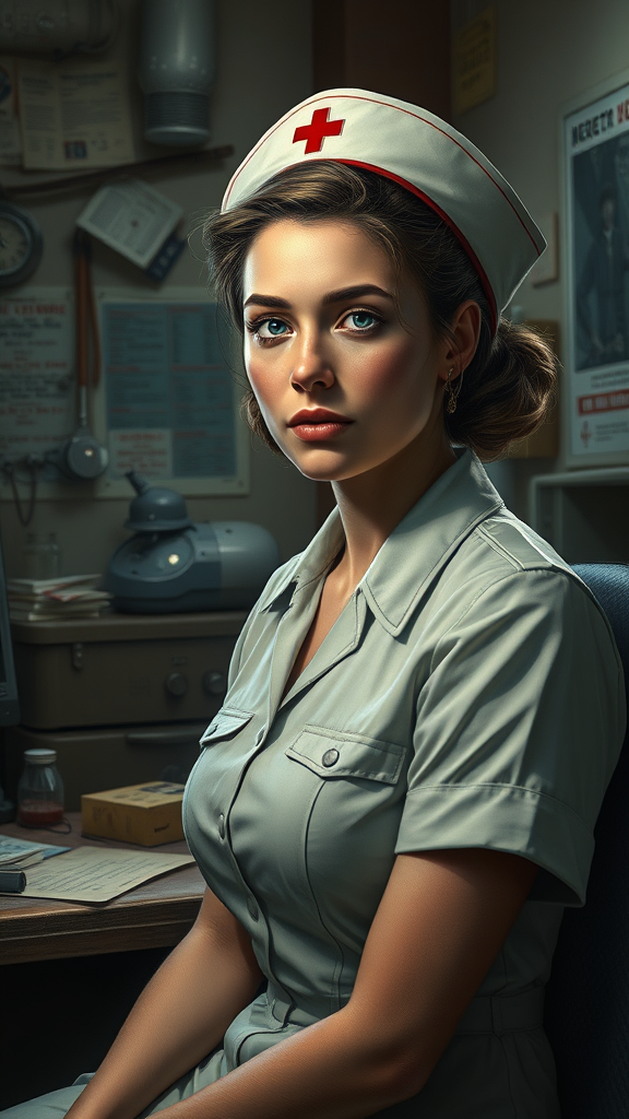 WWII nurse in an office, hyper realistic digital painting with cinematic lighting, showcasing intricate details and beautiful concept art. The scene is a masterpiece with 8k resolution, reminiscent of trending works on ArtStation. Influenced by the styles of Magali Villeneuve, Artgerm, Greg Manchess, Tom Bagshaw, and Jeremy Mann. The artwork captures a sense of calm and focus as the nurse is surrounded by period-appropriate medical equipment and wartime memorabilia, her expression one of quiet determination. There is a touch of surrealism with subtle distortions, ensuring a unique and captivating piece.