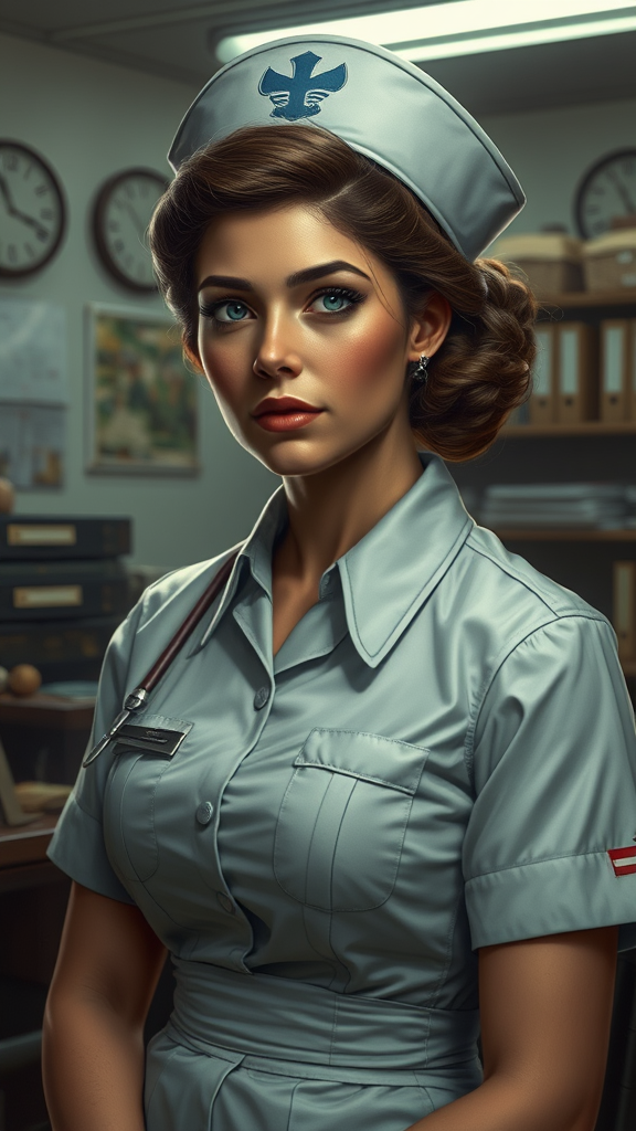 WWII nurse in an office setting, highly detailed and meticulously crafted, cinematic lighting enhances the scene, concept art style with intricate elements, hyper-realistic and digital painting quality, trending 8k masterpiece on artstation, influenced by the styles of Magali Villeneuve, Artgerm, Greg Manchess, Tom Bagshaw, and Jeremy Mann. The composition is cohesive and clear, maintaining focus on the subject without distortions or anomalies, ensuring a seamless and captivating visual experience.