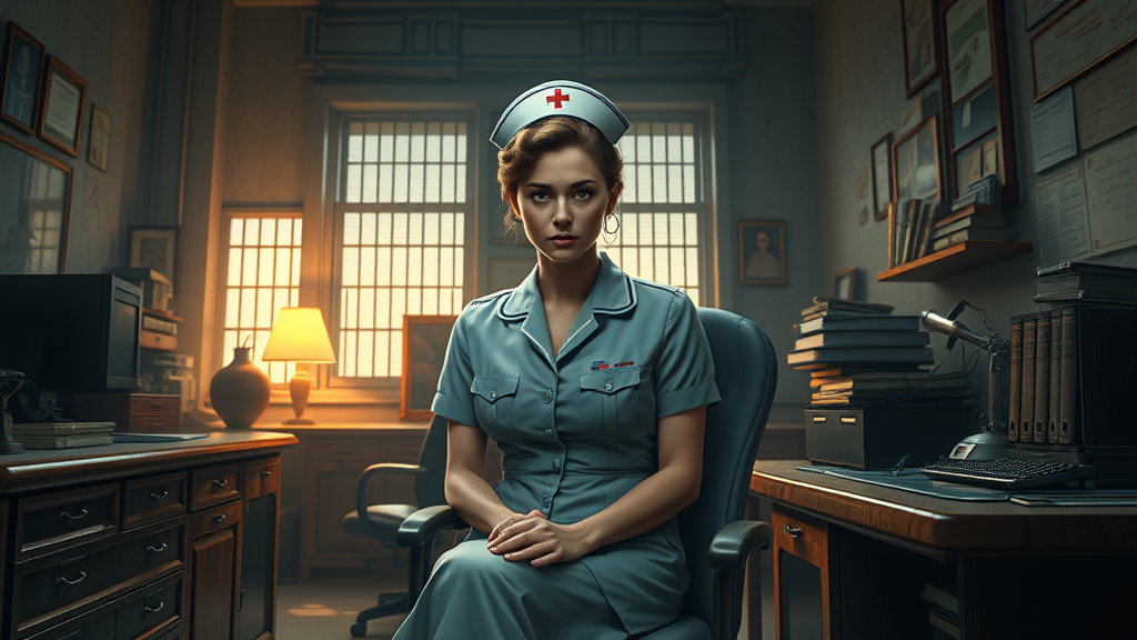 WWII nurse seated in a meticulously detailed office, bathed in cinematic lighting, concept art style, illustration showcasing intricate details, masterpiece quality, hyper-realistic digital painting rendered in 8k resolution, trending on ArtStation, reminiscent of works by Magali Villeneuve, Artgerm, Greg Manchess, Tom Bagshaw, and Jeremy Mann, with a focus on harmony and elegance, avoiding disjointed or distorted elements, with every detail in sharp focus and a sense of history and atmosphere enveloping the scene.