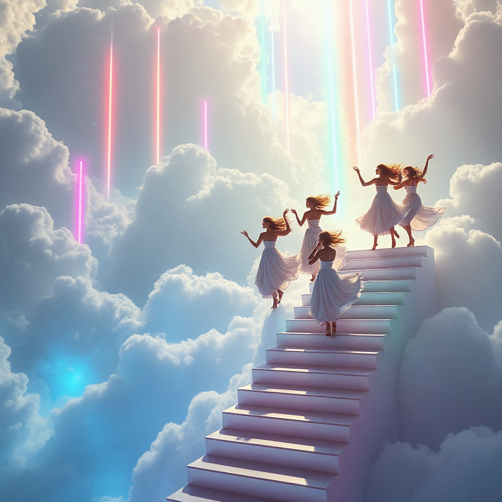 Xanadu. Mythology meets modern times. Light, wind, neon, beautiful muses. High up in the clouds, sunlight filters through them. Brightly lit pillars of neon in various colors extend upwards to the sky. There are stairlike landings within the clouds, and all 9 of the beautiful muses from Xanadu are dancing on them in different poses. They all wear silky silvery-white tiered skirtlike frocks that billow freely in the wind. There is sparkly magic within the clouds because they are there. They ascend, leaving trails of light. A bright neon dance club within the clouds, as they celebrate.
