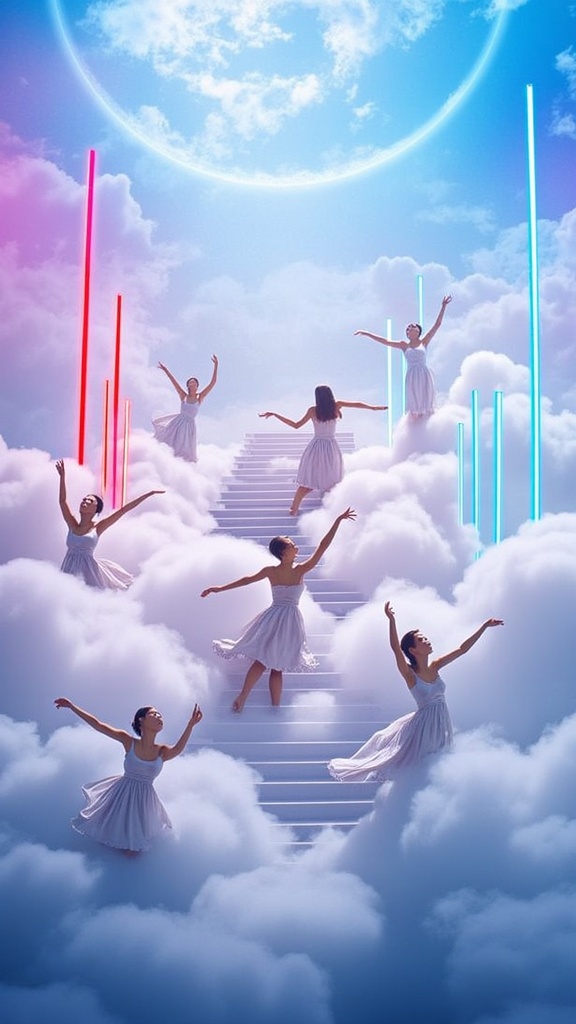 Xanadu. Mythology meets modern times. Light, wind, neon, beautiful muses. High up in the clouds, sunlight filters through them. Brightly lit pillars of neon in various colors extend upwards to the sky. There are stairlike landings within the clouds, and all 9 of the beautiful muses from Xanadu are dancing on them in different poses. They all wear silky silvery-white tiered skirtlike frocks that billow freely in the wind. There is sparkly magic within the clouds because they are there. They ascend, leaving trails of light. A bright neon dance club within the clouds, as they celebrate.