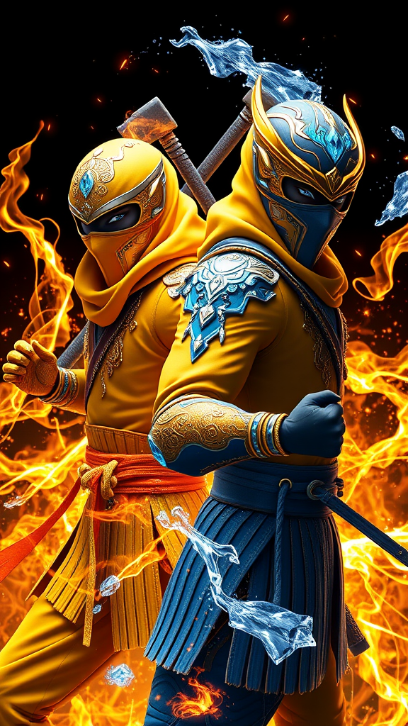 Yellow ninja and blue ninja, embodying the elemental forces of fire and ice, adorned with intricate patterns of gold and diamond, depicted in an ultra-realistic 3D render, capturing the dynamic energy and contrast of their powers in a visually captivating composition with a sleek, modern aesthetic.
