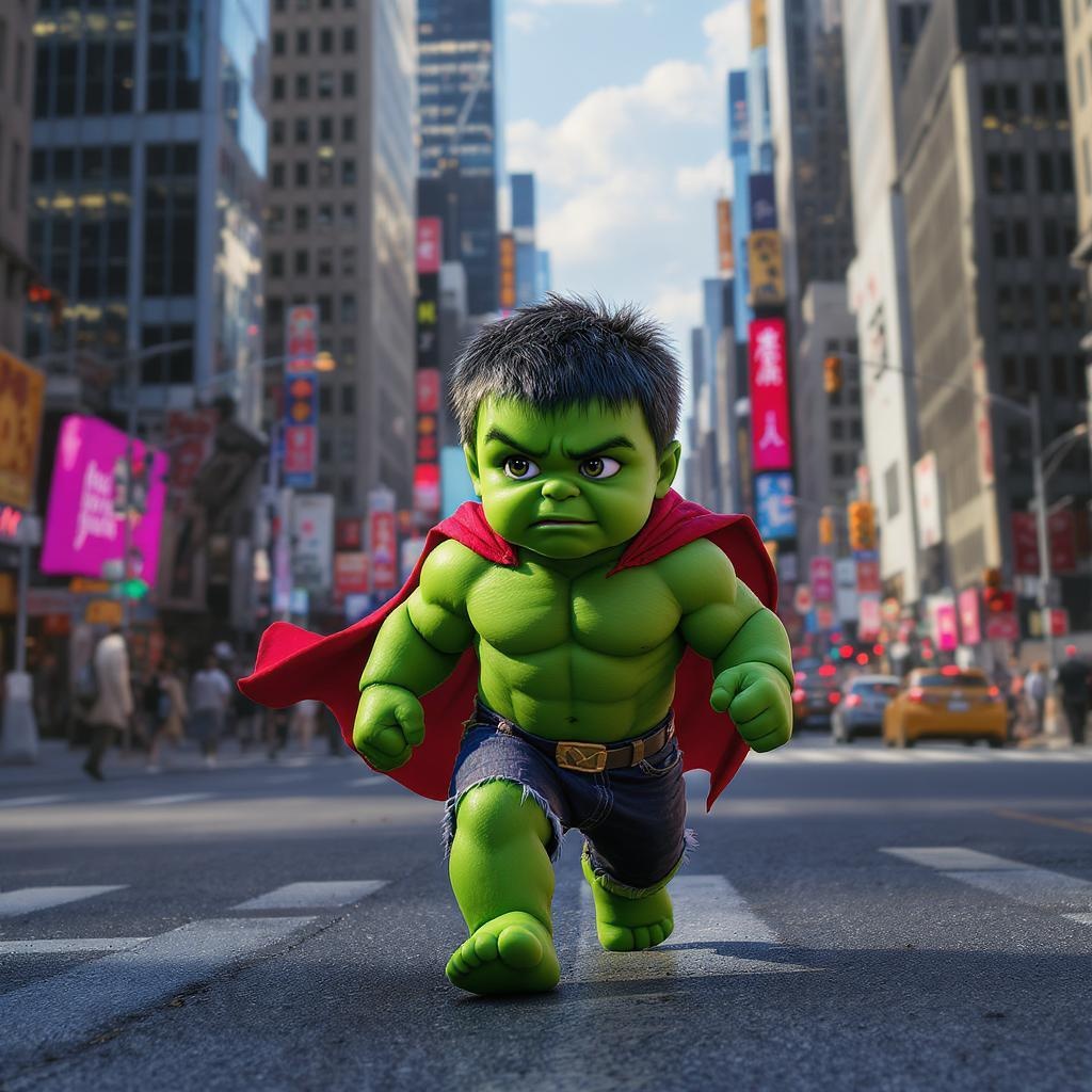 View this AI-generated image featuring a miniature yet powerful hulk like toddler with vibrant green skin exuding immense strength the scene is set in a bustling city with towering skyscrapers capturing an intense photorealistic and cinematic atmosphere as the tiny superhero navigates the urban land