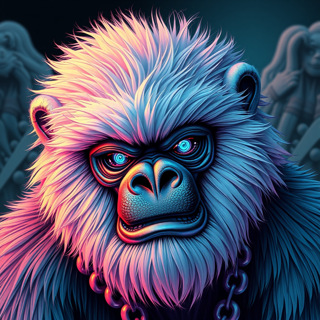 Yeti chic style Gucci 1980s vibes, character design, vibrant color palette, aquatint effect, glowing blacklight aesthetics, intricate ballpoint pen detailing, charcoal texture, infused with basalt and ceramic elements, brushed aluminum finish, citrine highlights, ash gray tones, monochrome contrasts, soft blush and buff hues, playful candy colors, inspired by Alex Grey’s visionary art, 3D dimensionality.