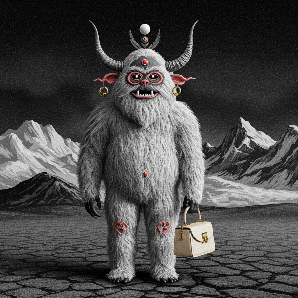 Yeti couture fusion Gucci 1980s style 5, character design, vibrant color palette, aquatint blended with blacklight artistry, textured ballpoint pen illustrations, charcoal sketch elements, basalt-inspired patterns, ceramic and brushed aluminum textures, citrine accents, ash gray tones, monochrome black and white, with soft blush and buff candy colors, influenced by Alex Grey's surrealism, featuring a 3D aesthetic.