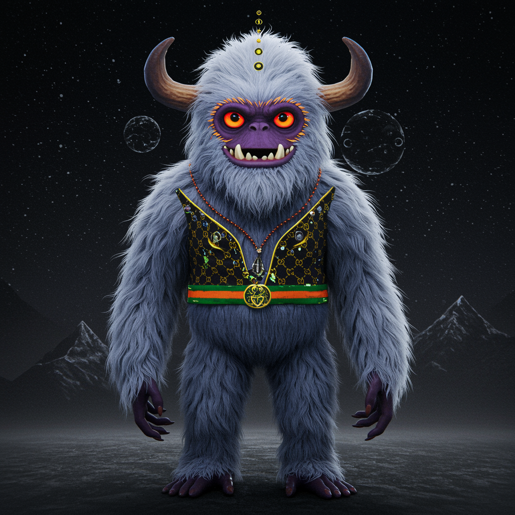 Yeti couture inspired by 80s Gucci style, creative character design featuring a vivid and surreal color palette, blending aquatint techniques with elements of blacklight painting. Integrate ballpoint pen artistry and charcoal textures with the rugged feel of basalt and polished ceramic. Highlight brushed aluminum detailing with citrine accents, contrasted against ash gray tones. Infuse black and white elements with subtle blush and buff hues, complemented by playful candy colors. Channel the visionary aesthetics of Alex Grey in a dynamic 3D representation.