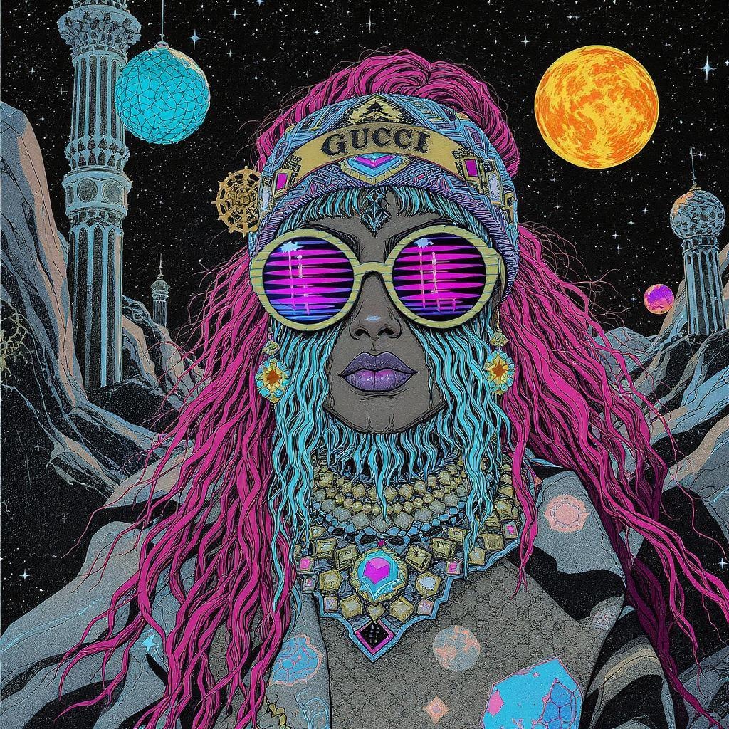 Yeti couture style fused with Gucci 1980s influence, character design incorporating vivid color palettes with aquatint textures, blacklight-inspired illustrations, ballpoint pen art details, and charcoal shading. Integrate elements of basalt structures, ceramic finishes, brushed aluminum surfaces, and citrine accents. Use ash gray as a base, highlighted with monochrome tones, and touches of blush, buff, and candy colors. Emulate the intricate visual patterns of Alex Grey, layered with a 3D perspective, creating a surreal yet cohesive design aesthetic.