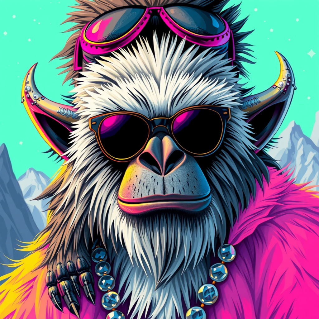 Yeti fashion infused with 80s Gucci flair, character design melding vibrant color palettes, combining aquatint, blacklight painting effects, and intricate ballpoint pen artistry. Embrace the textural richness of charcoal, basalt, and ceramic, with brushed aluminum finishes and the glow of citrine. Contrast ash gray, stark black and white, with delicate blush, buff, and playful candy colors. Inspired by Alex Grey's visionary style, envision these elements in a 3D landscape, merging retro elegance with mythical allure.