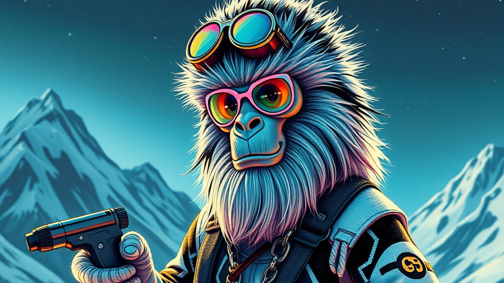 Yeti fashion mode Gucci 80s, character design with a vibrant color palette, aquatint style, evoking blacklight painting with ballpoint pen detailing, embodying charcoal and basalt textures, ceramic brushed aluminum sheen, citrine and ash gray hues, a mix of black and white with blush tones, buff candy colors inspired by Alex Grey, 3D elements enhancing the design.