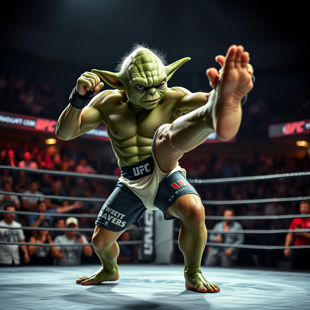 Yoda, exhibiting the physique and intensity of a seasoned UFC champion, stands fiercely in an octagonal ring under bright arena lights; his green skin glistens with a light sheen of sweat. His muscular build reflects the power and agility honed through years of training. Dressed in customized fighter shorts featuring a Jedi emblem, his expression is a mix of determination and calm focus. The scene captures him mid-action, delivering a precise spinning kick with his small but powerful legs, the force of the move visible through the air. Fans in the background are a blur of excitement, while the lights and shadows emphasize his formidable presence, evoking a sense of both mystery and undeniable prowess.