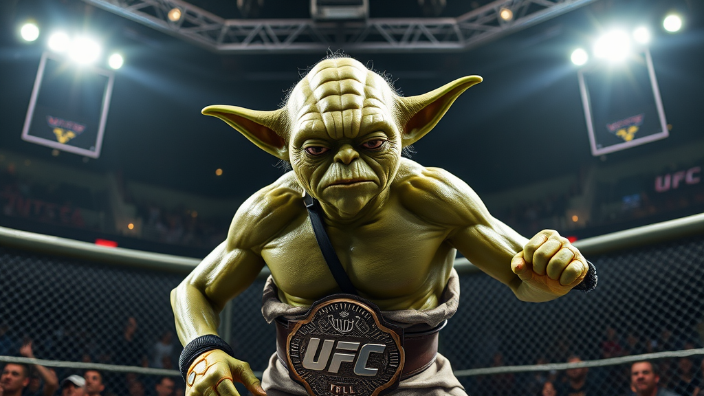 Yoda in a UFC octagon, wearing a championship belt, showcasing his agility and strength; his wise eyes focused and intense, muscles toned under his green skin, sweat glistening; the bright lights casting dramatic shadows; an arena filled with cheering fans, energy electric in the air.
