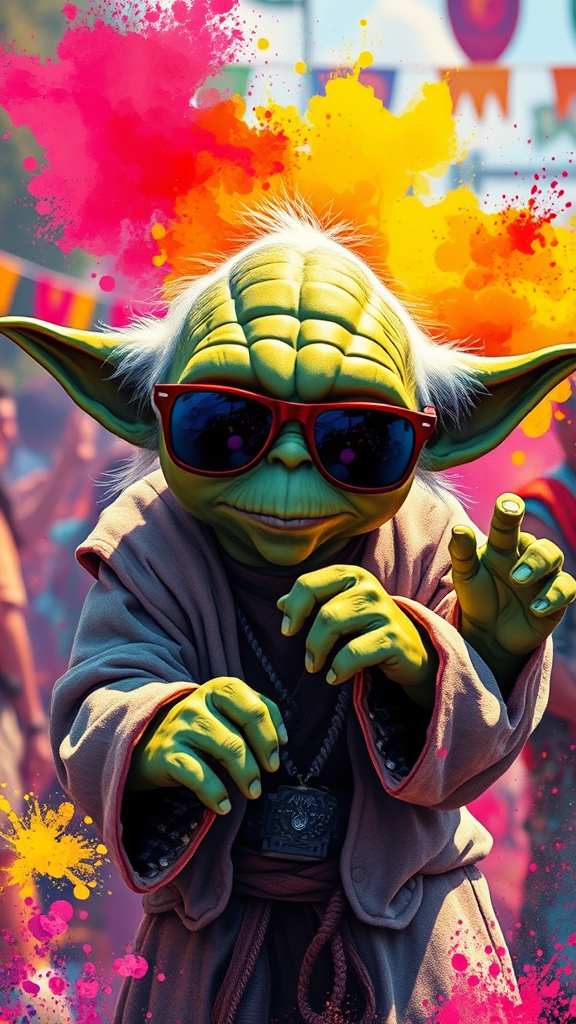 Yoda wearing sunglasses, grooving energetically at a vibrant festival, surrounded by a dynamic splash of colorful ink, rendered in ultra-high definition detail.