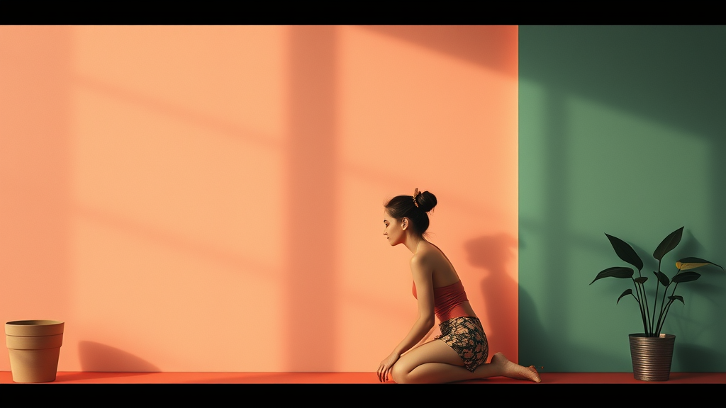 Yoshitomo Nara influence, Wes Anderson flair, modern casualism, retro vibe, sexy minimalism, subtle sensuality, abstract minimalist backdrop, Yoshitomo Nara essence, Wes Anderson charm, contemporary casualism, vintage touch, sleek minimalism.