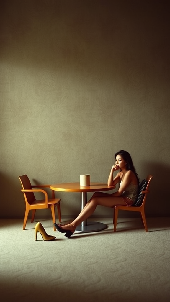 yoshitomo nara influence, wes anderson style, new casualism vibe, retro aesthetic, minimalist sexy allure, subtle suggestive details, abstract minimalist setting, yoshitomo nara inspiration, wes anderson charm, new casualism feel, vintage appeal, minimalistic elegance