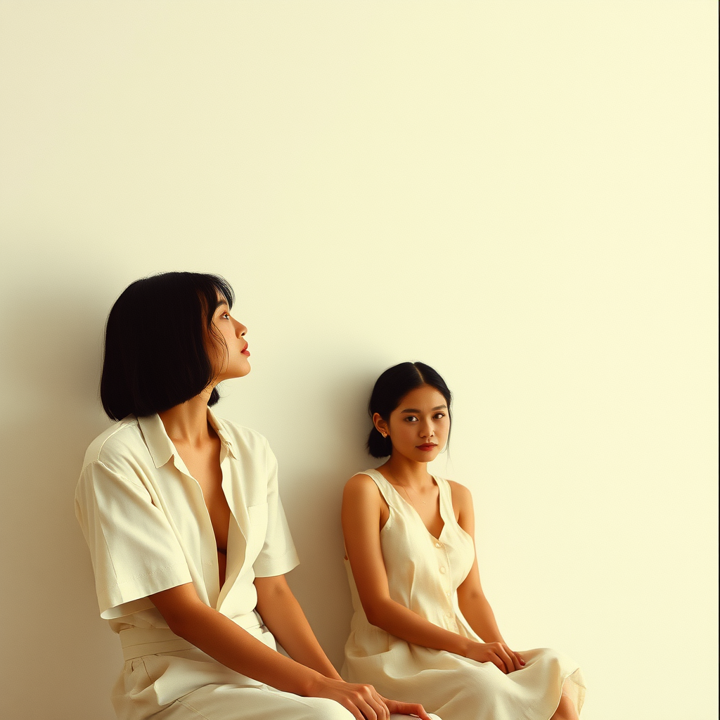 yoshitomo nara-inspired, wes anderson-influenced, contemporary casualism blended with retro aesthetics, minimalist yet alluring, subtle sensuality, abstract minimalism with a focus on simplicity, nara's distinctive style fused with anderson's unique visual storytelling, modern casualism, vintage charm, clean and understated elegance.