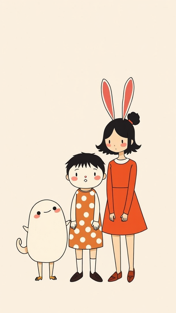 yoshitomo nara-inspired whimsical characters, wes anderson color palette with a touch of nostalgia, new casualism meets retro vibes, sleek minimalism with subtle allure, abstract minimalist backdrop, playful yet refined aesthetic, yoshitomo nara's charming simplicity, wes anderson's quirky style, vintage elements with modern twist, clean lines and muted tones.