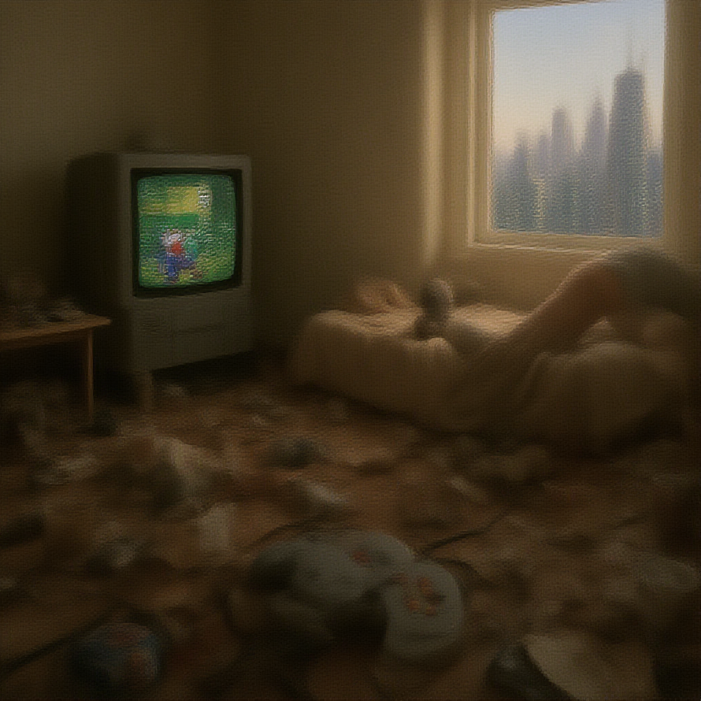 You groggily wake up from a nap, lying back on your bed, with a Nintendo 64 controller loosely held in your hand. The screen of your bulky CRT TV displays a pixelated Mario standing idle in the middle of a Super Mario 64 level, waiting for your return. Around the room, remnants of last night's fast food adventure are scattered haphazardly: crumpled burger wrappers and empty soda cups crowd your desk and floor. Sunlight streams through the open window, casting a soft glow over the clutter, and outside lies a sprawling cityscape, its skyline a futuristic blend of looming skyscrapers and neon lights akin to a vision of 1970s Tokyo.