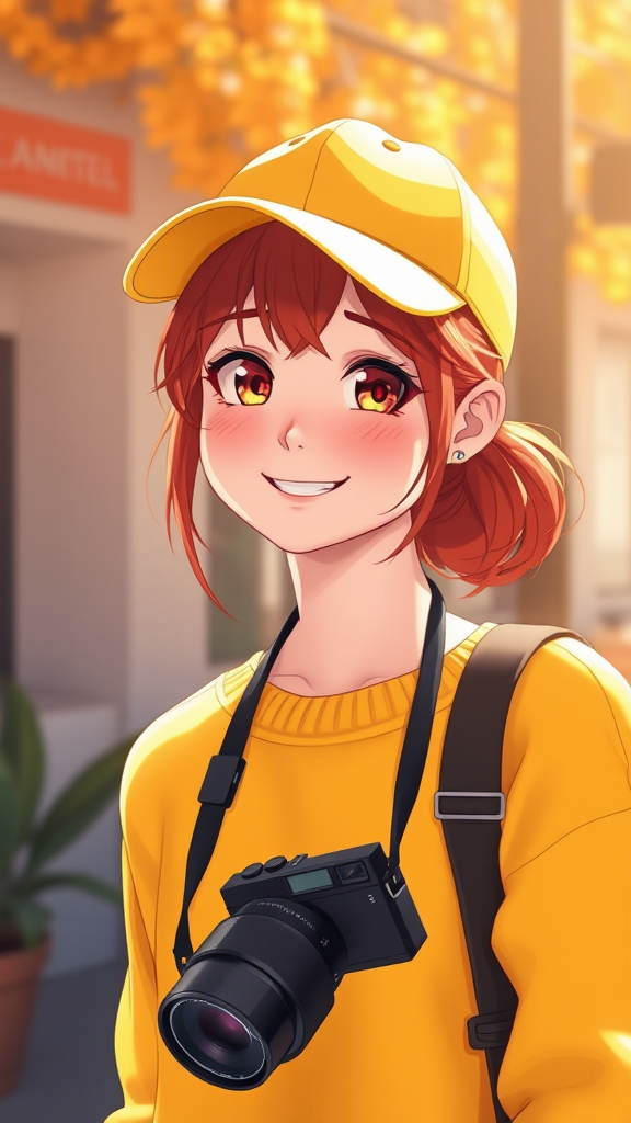 Young adult female in her mid-twenties with ginger hair, lively eyes, and a radiant smile. She’s wearing a vibrant yellow jumper and a matching yellow baseball cap, her camera hanging casually around her neck. The environment is bathed in beautiful, natural lighting with a touch of volumetric effects, creating a warm and inviting atmosphere. The character design is influenced by Kentaro Miura’s distinct detail and style, translating into a 3D cartoon-inspired anime look. The scene is crafted using high-quality CGI, showcasing adorable and lifelike features with a doll-like innocence. The rendering in octane highlights the intricate details, making the digital painting both captivating and realistic. The composition is free of any deformities, maintaining perfect proportions and ensuring clarity through every detail, avoiding any imperfections or digital artifacts that could detract from its beauty.