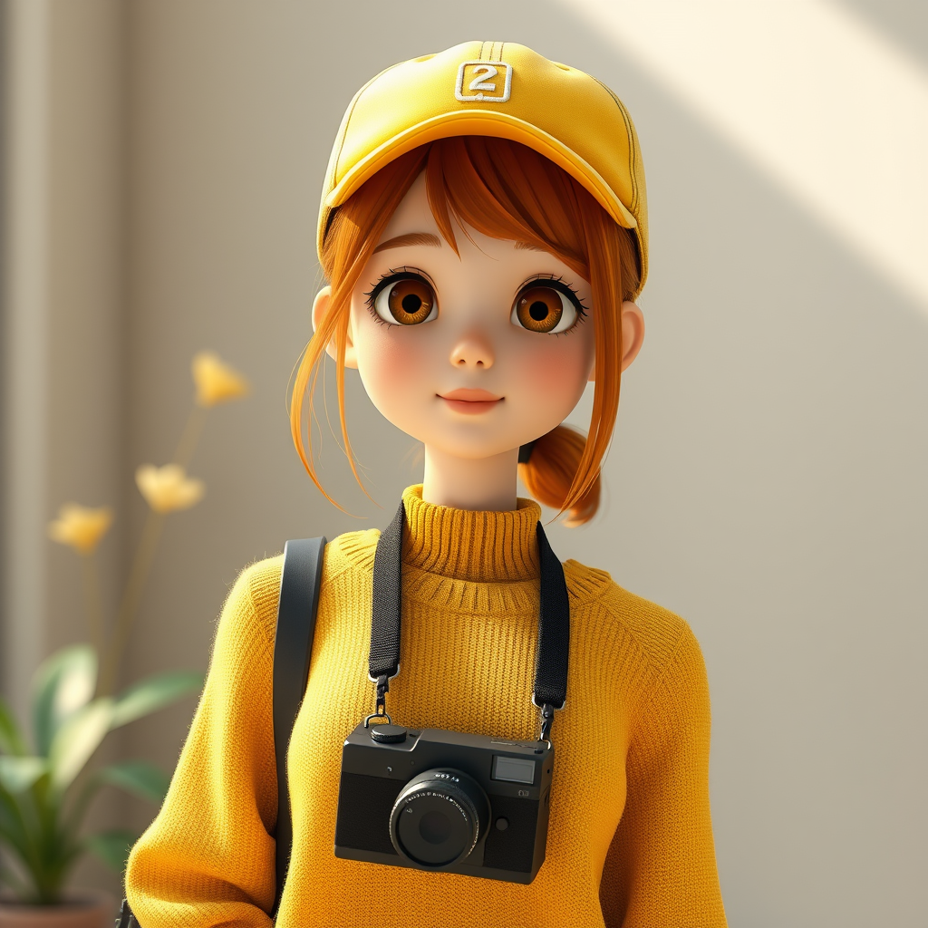 Young adult female in mid-twenties with ginger hair, a camera around her neck, dressed in a yellow jumper and a yellow baseball cap. The scene showcases character design and animation in the style of Kentaro Miura, with beautiful natural lighting and volumetric effects. She is depicted in an adorable 3D CGI format resembling a doll, using Octane Render, and features elements of cartoon, anime, and illustration. The digital art showcases a clean, elegant composition with harmonious proportions and a charming expression.
