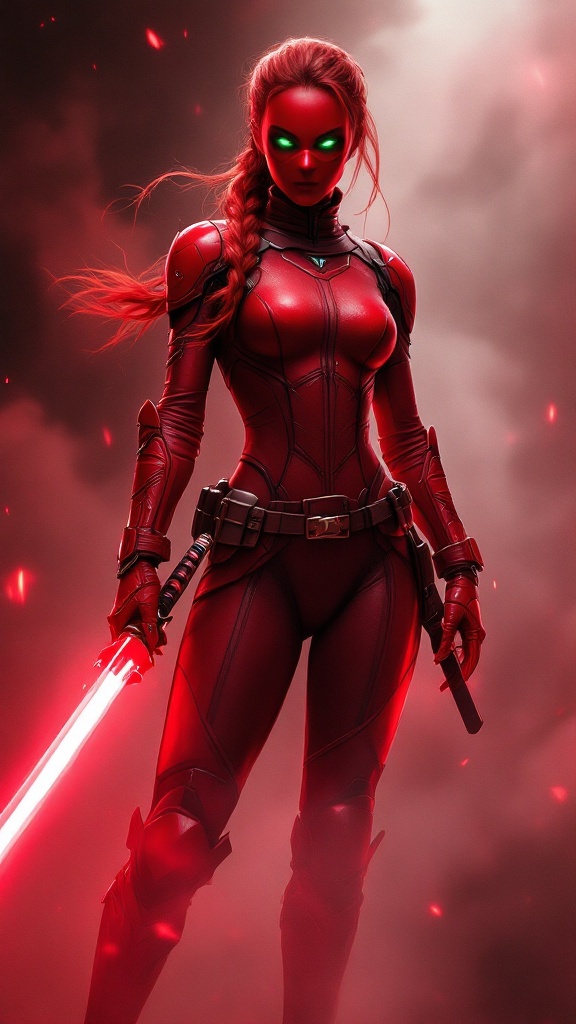 Young adult female super-hero. College student by day, vigilante warrior by night. She can create a red fog/mist that gives her subterfuge or announces her presence. She can walk through solid objects such as walls, and weapons pass harmlessly through her. She also has quick reflexes and dexterity. She can aldi create solid objects from energy-- her favorites arr 2 Razor-Sharp katanas that never need shapening. Tall, thin, lithe but strong and fit. Quick, agile. Carrot-top red hair , long and combed back into one long braid in the back of her head. Glowing green eyes, usually covered by a red superhero mask. A Scarlet-red latex body suit that gives her complete coverage. Red shoulder pads, red knee pads, red arm length gloves, red knee-high boots, red metallic tactical belt. She moves silently, never making a sound. If you see The red fog/mist, she's either there to help you, or bring you to justice. Full body pose.