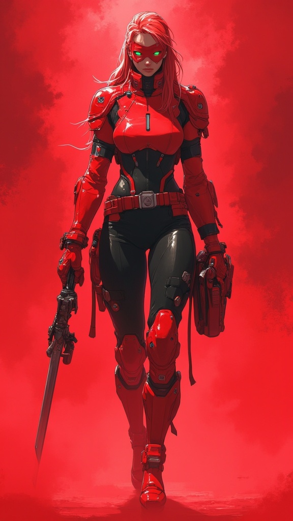 Young adult female super-hero. College student by day, vigilante warrior by night. She can create a red fog/mist that gives her subterfuge or announces her presence. She can walk through solid objects such as walls, and weapons pass harmlessly through her. She also has quick reflexes and dexterity. She can aldi create solid objects from energy-- her favorites arr 2 Razor-Sharp katanas that never need shapening. Tall, thin, lithe but strong and fit. Quick, agile. Carrot-top red hair , long and combed back into one long braid in the back of her head. Glowing green eyes, usually covered by a red superhero mask. A Scarlet-red latex body suit that gives her complete coverage. Red shoulder pads, red knee pads, red arm length gloves, red knee-high boots, red metallic tactical belt. She moves silently, never making a sound. If you see The red fog/mist, she's either there to help you, or bring you to justice. Full body pose.