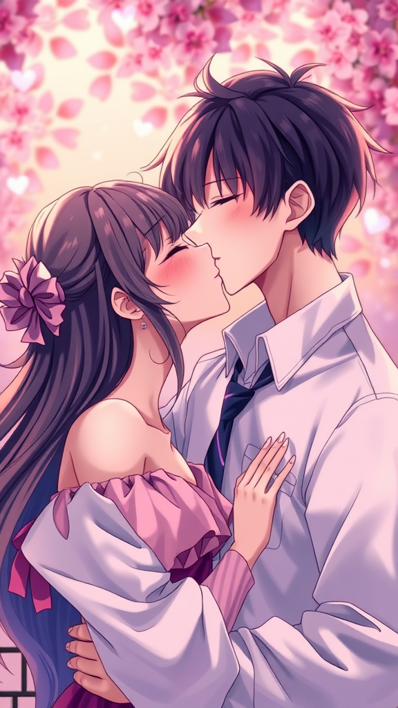 Young anime couple sharing an intimate kiss, with vibrant and captivating visuals, inspired by the art style of Yamatogawa, emphasizing a romantic and alluring atmosphere, featuring a beautifully detailed boy and girl scene with an aesthetic reminiscent of ero anime, placing an emphasis on the emotional connection and captivating expressions, presented in high quality with a focus on clarity and artistic finesse.