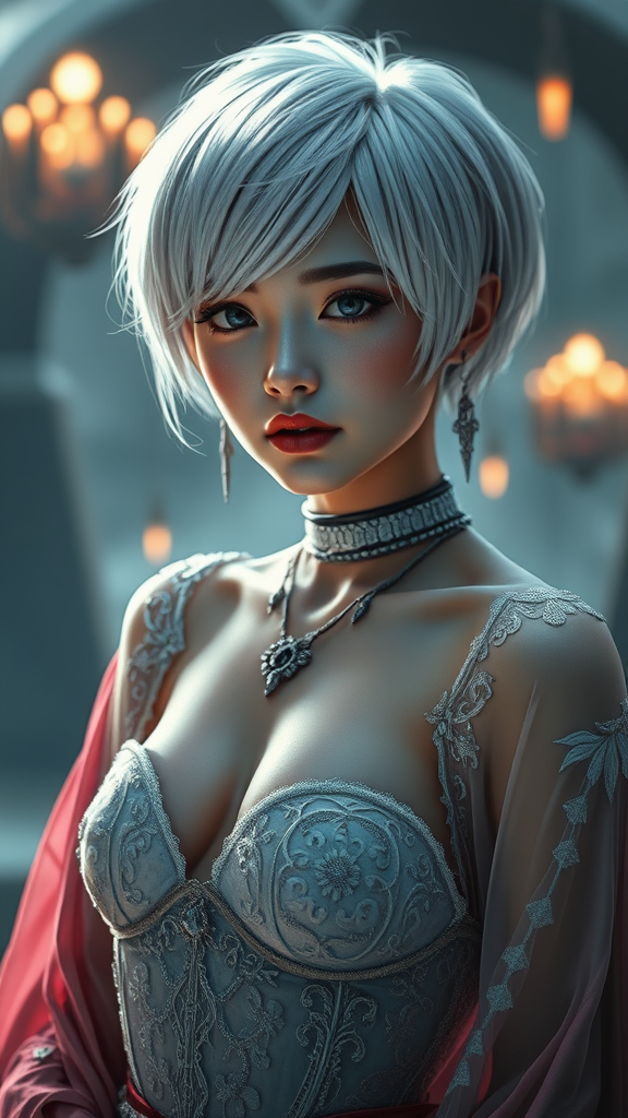 Young Asian girl with short white hair, featuring a detailed and gorgeous face, exuding a regal aura as the queen of the dead. Her toned stomach and small breast subtly revealed, set against a fantasy backdrop. Hyperrealistic and cinematic lighting highlights her ethereal beauty, capturing a breathtaking quality akin to photography. The environment is stunning and expansive, reminiscent of a wide-angle view. Inspired by the styles of Greg Rutkowski and Magali Villeneuve, this CGI render employs octane techniques, presenting a flawless, doll-like appearance. Every element is highly detailed, avoiding imperfections like bad anatomy or disfigurement.