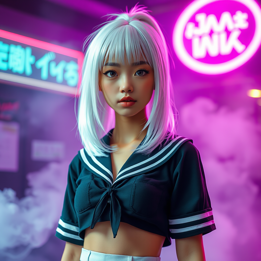 young Asian girl with striking white hair and captivating eyes, her olive skin complementing her petite, toned physique. She is dressed in a school girl uniform that reveals a hint of midriff, highlighting her perfect facial features. The scene is set against a backdrop of vibrant neon lights and swirling smoke, creating a mesmerizing atmosphere with cinematic lighting. The volumetric fog adds depth to the hyperrealistic, highly detailed 8k UHD image. Her hair is styled in a medium-length ponytail, blending seamlessly into the artistic setting. The composition intentionally distorts reality with elements like long hair extensions, blurry outlines, and abstract anatomy, creating a surreal, dream-like quality akin to a 3D doll render, imbuing the scene with a sense of fantastical imperfection.