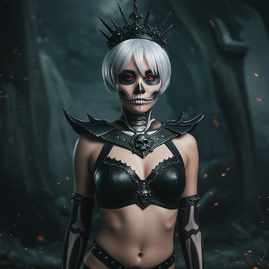 View this AI-generated image featuring young asian woman with striking short white hair and a beautifully detailed face embodying the queen of the dead she has a toned midriff and small breast set against a fantasy background hyperrealistic and cinematic lighting enhance the scene offering a breatht