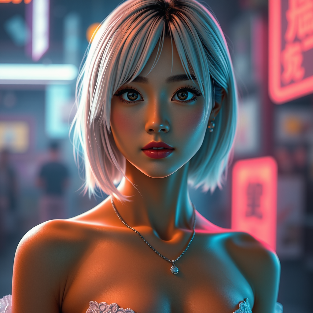 Young Asian woman with striking white medium-length hair, captivating symmetrical eyes, olive skin, and a petite toned body, showcasing her midriff. Her perfect face glows under the neon light background and cinematic lighting, giving a breathtaking appearance in 8k UHD. The scene combines photorealism and hyperrealism for a stunning visual impact. Her jewelry adds elegance while CGI artistry brings her to life in a scene reminiscent of anime or digital painting. The detailed illustration captures a blend of realistic and imaginative elements, avoiding errors like poor quality or distorted features, and ensuring a seamless, high-quality portrayal.