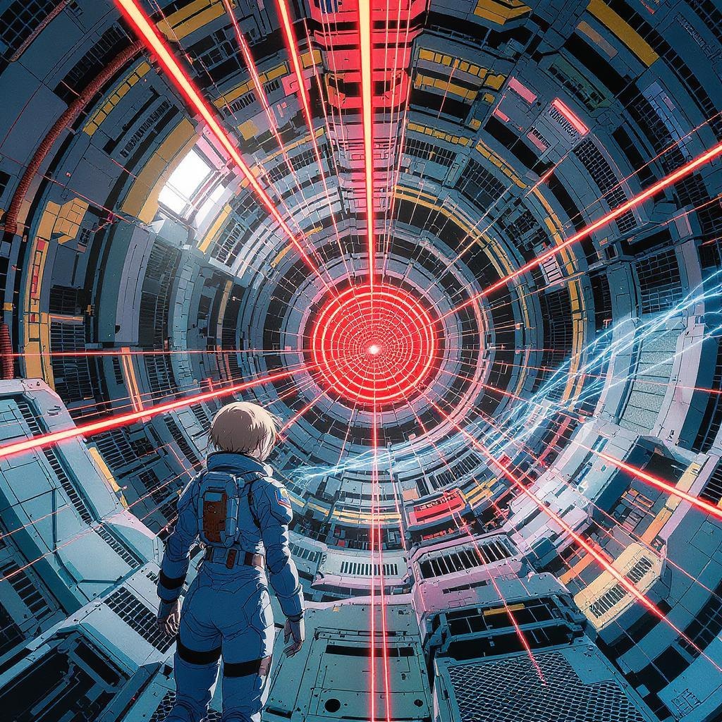 Young astronaut girl in a futuristic space suit standing inside an expansive spaceship, reminiscent of Tsutomu Nihei's distinct style with influences from Sidonia no Kishi. The environment boasts gigantism with multi-story structures and a hyper-detailed laser generator placed in the center. High-tech aesthetics embrace Sci-Fi elements, with beams of light trailing from the sky, creating dynamic energy clots and flashes of acceleration. The scene captures a sense of speed, illustrated in an anime-style drawing, merging manga graphics with 8K, HD super-resolution quality for immersive visuals. The perspective is a first-person view, showcasing the intricacies of the space interior with a vivid depiction of the laser coursing through the space amid the advanced technological backdrop.