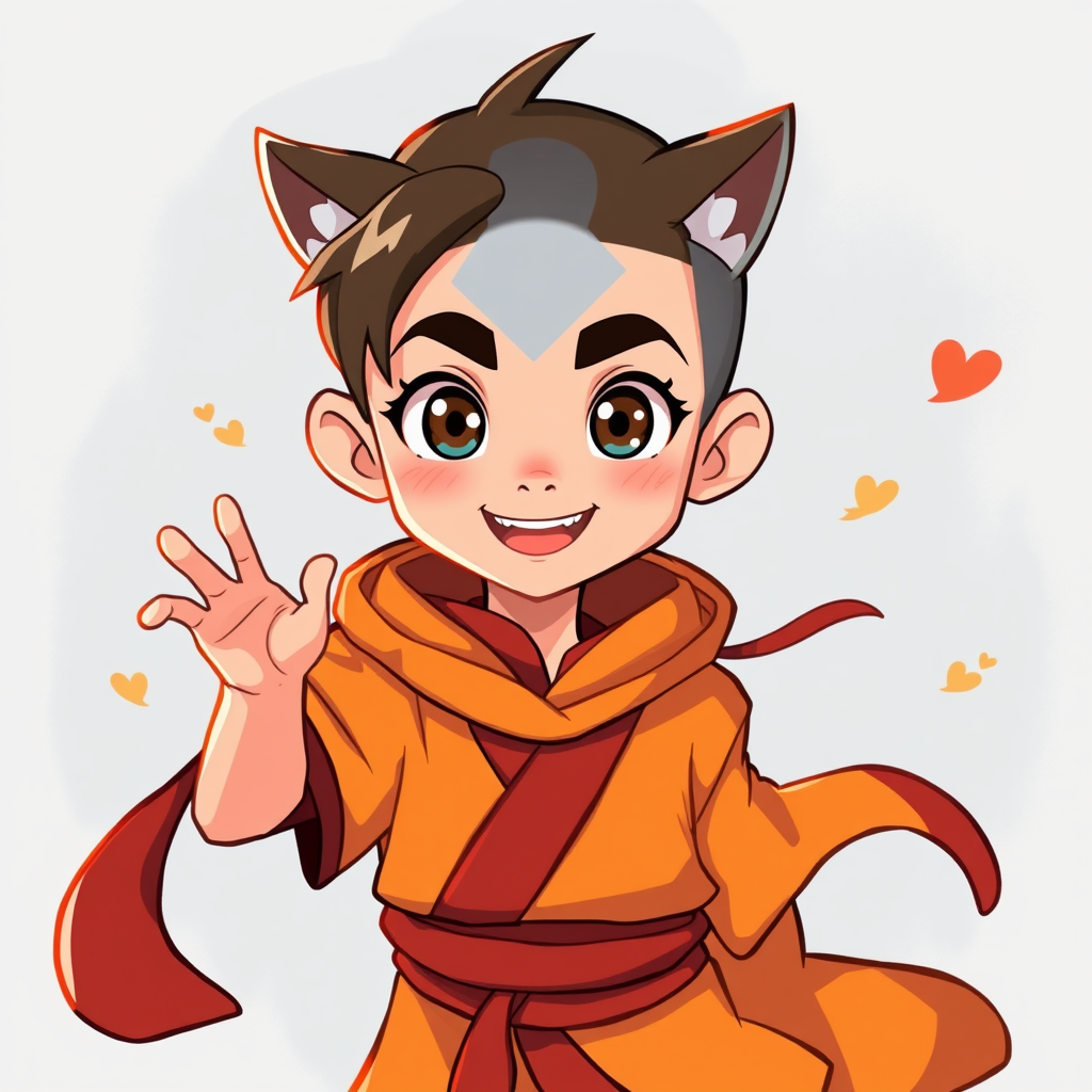 Young Avatar Aang, the Last Airbender, depicted in a vibrant and dynamic Furaffinity style, showcasing his youthful exuberance. He wears flowing orange robes complemented by deep red accents, with a playful twist as small animal-like features are added, enhancing his connection to nature and the spirit world. His wide, expressive eyes and a cheerful smile convey his adventurous spirit, while subtle elemental motifs dance around him, hinting at his control over the four elements.