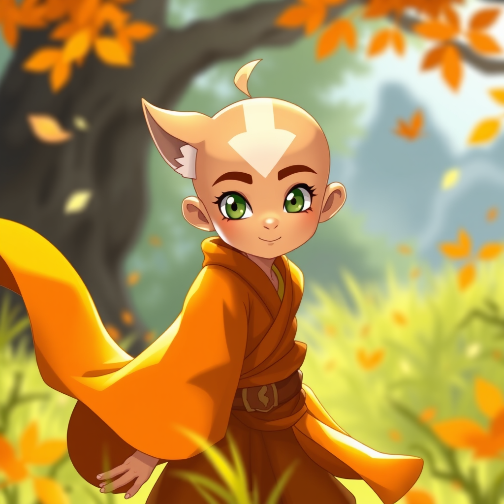 Young avatar Aang, the last airbender, depicted in a vibrant, anthropomorphic style reminiscent of furaffinity with playful animalistic characteristics. His iconic orange robes flow elegantly as if caught in a gentle breeze, blending seamlessly into the lively atmosphere around him. His bright eyes reflect his adventurous spirit, and a subtle aura of elemental energy surrounds him. This portrayal brings a unique charm and a sense of animated vitality, leaving out any conventional Asian or less-desirable features to focus purely on his essence as a spirited, youthful character in a stylized artistic rendition.