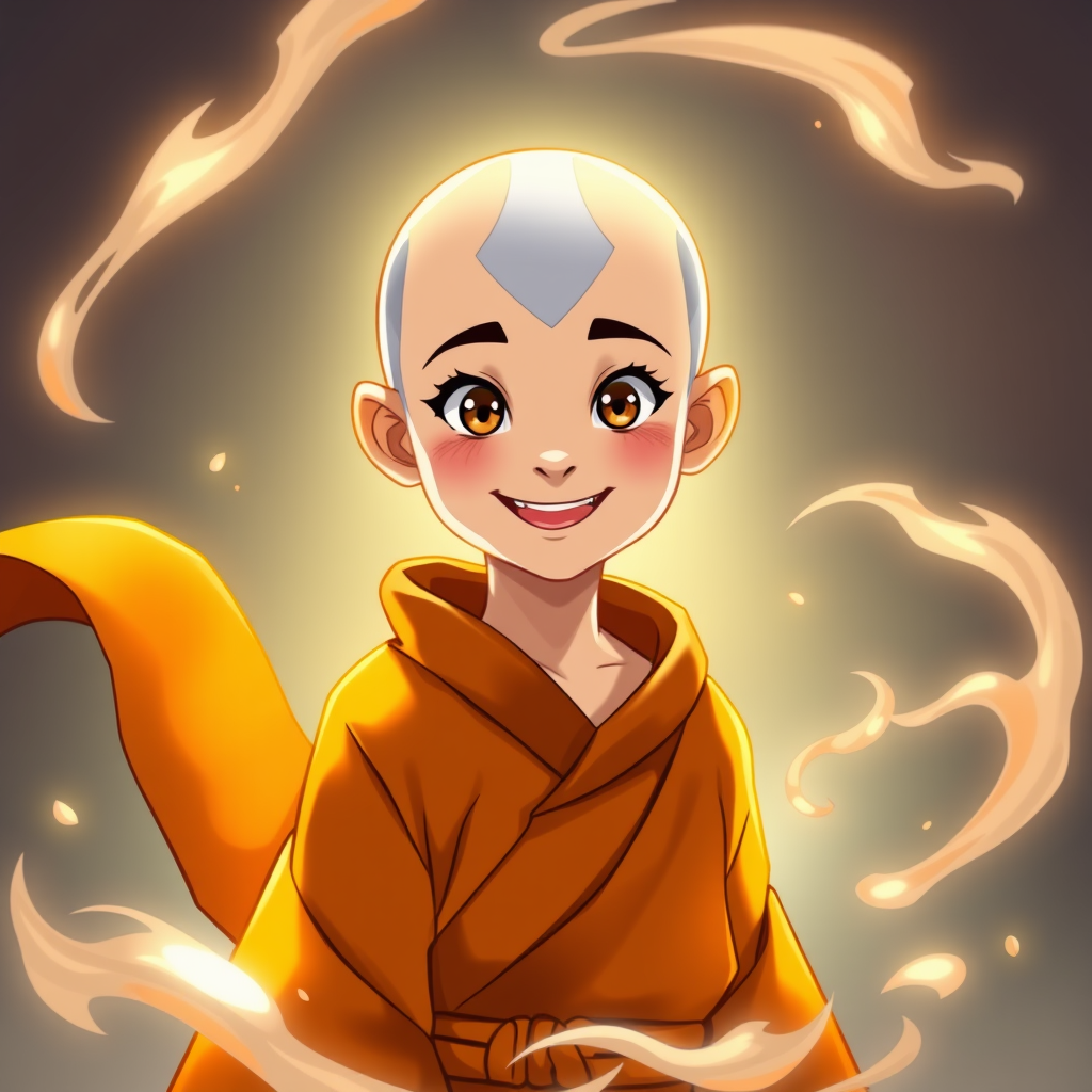 Young Avatar Aang, the last airbender, depicted in the vibrant style reminiscent of furaffinity, wearing flowing orange robes; his youthful features animated with an expressive smile and bright eyes, surrounded by softly swirling elements of air; the scene enriched with a warm aura, hinting at his playful yet determined nature, while incorporating the harmonious balance of traditional and whimsical themes.