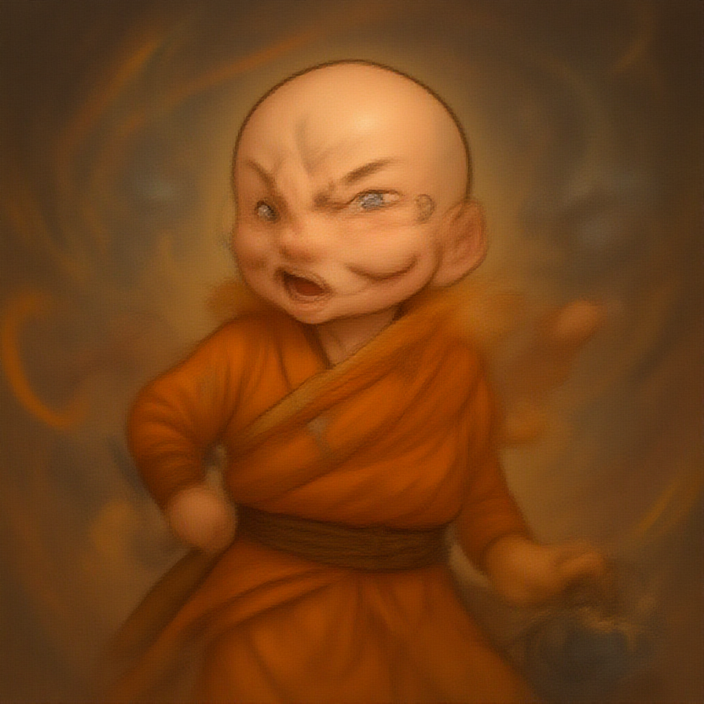 Young Avatar Aang with his characteristic playful energy, depicted in vibrant fur textures and detailed expression, wears traditional orange robes with subtle tribal patterns. His eyes sparkle with mischief, and his glider rests at his side, hinting at adventures yet to come. The backdrop features swirling elements echoing the four bending abilities, rendered in rich colors that contrast with his attire. Elements of the scene are softly blurred to focus on Aang's dynamic pose, capturing his youthful exuberance and connection to the spirit world.