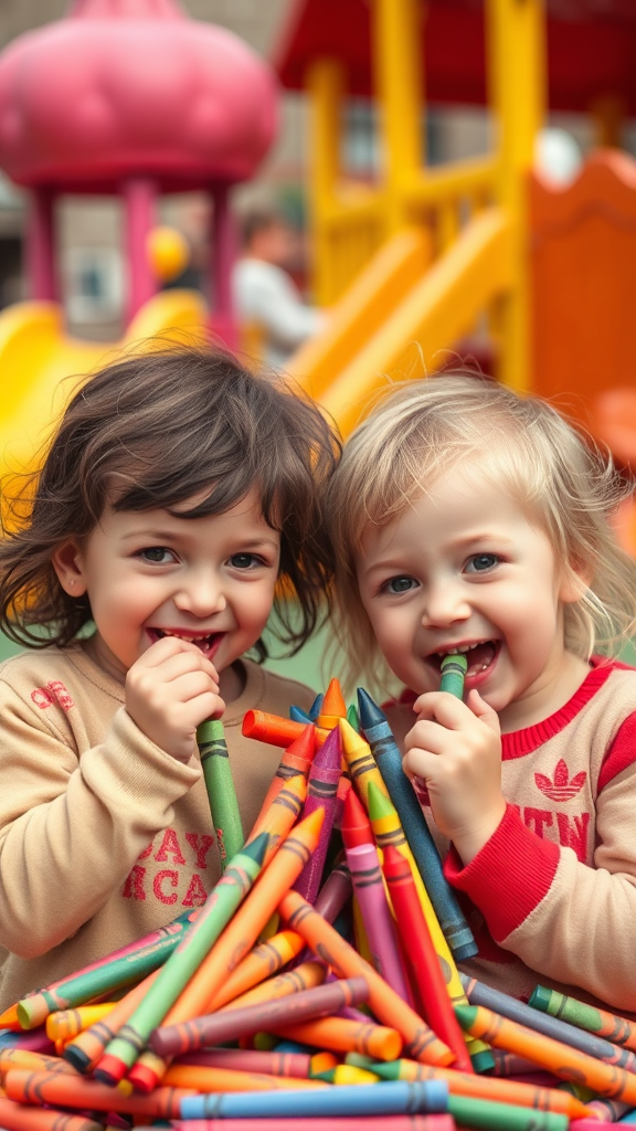 young children joyfully nibbling on colorful crayons amidst a whimsical playground scene, with vibrant primary colors surrounding them and a sense of playful mischief in the air.