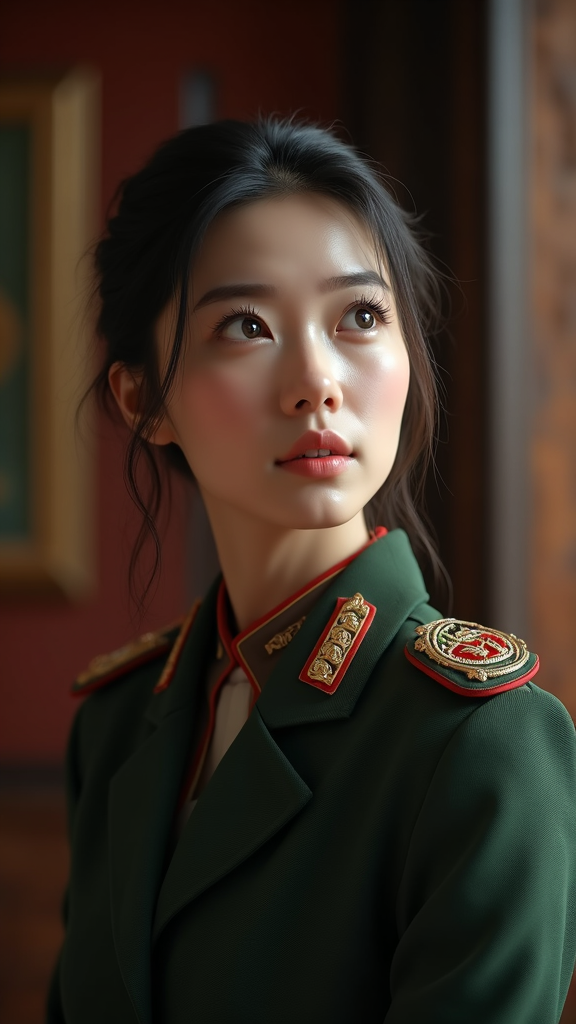 View this AI-generated image featuring a striking young chinese woman in elegant military uniform gazes upward with a look of inquisitive wonder set against a sophisticated indoor studio backdrop the meticulously crafted scene features dramatic interplay of light and shadow utilizing cutting edge un