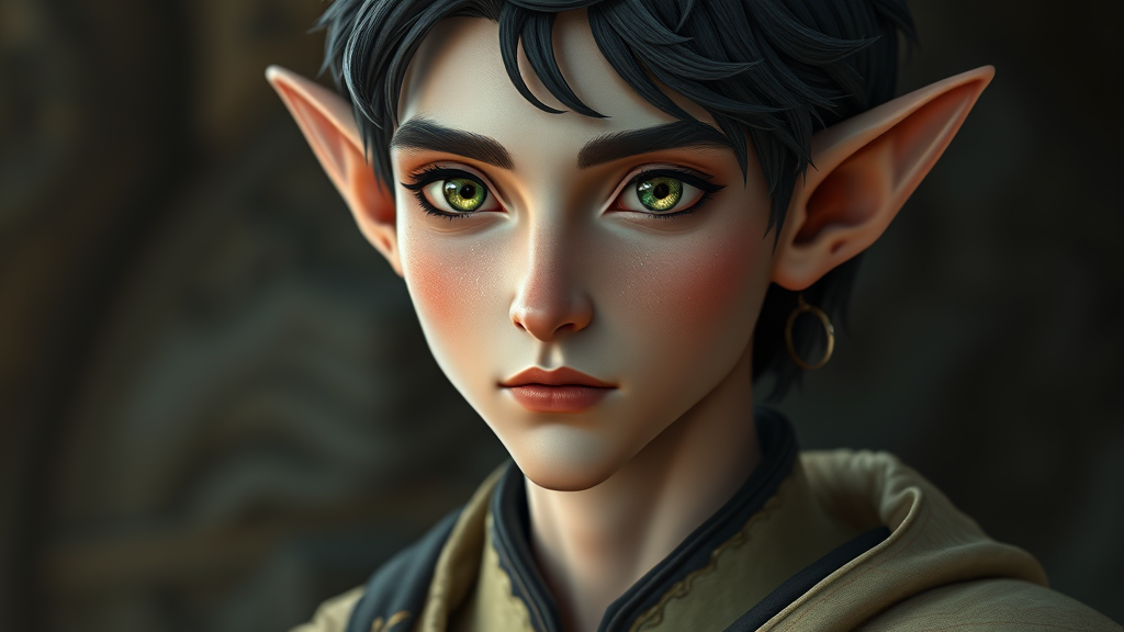 Young fair-skinned man, mystical elf with elongated ears, ivory complexion, deep onyx hair, eyes like green gems flecked with gold, sage, keeper of ancient texts, learned scholar, adorned in an exquisite robe, intricately crafted, mesmerizing gaze, inspired by Pixar's high definition, detailed features, illumination akin to a Rembrandt painting, Studio Ghibli whimsy, ethereal figure, fantastical allure, cinematic brilliance, fairy-tale essence, UHD.