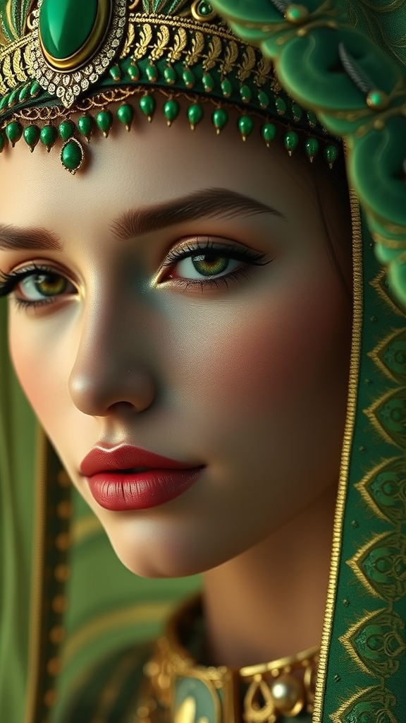 Young female face, green aesthetic, embracing the golden ratio with perfect symmetry, exuding elegance and luxury. Featuring intricate, ornate details, styled with ultra-realistic concept art. The portrayal is highly detailed, photorealistic, rendered using octane and 8k resolution in unreal engine. With sharp focus, the face is enveloped in ethereal volumetric lighting, reminiscent of art by Artgerm, Greg Rutkowski, and Alphonse Mucha, with a touch of Vraska Golgariās influence. A close-up captures the subtlety of makeupāreminiscent of Egyptian art interpreted by Christian W. Staudingerāblended with contemporary aesthetics. The image is award-worthy, akin to a Behance contest winner, possessing elements of video artistry and reimagined by industrial light and magic. The art possesses a shallow depth of field to emphasize exquisite face details, enriched with Egyptian makeup intricacies, reflecting a CGI masterpiece.