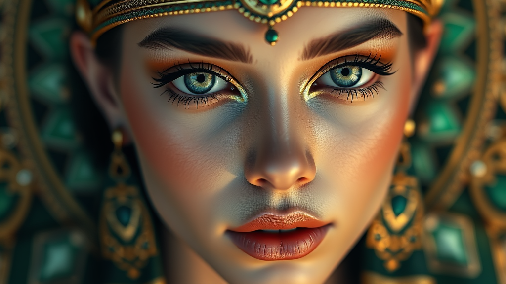 young female face, green aesthetic, youthful beauty, golden ratio, symmetrical elegance, ornate luxury, ultra-realistic concept art, intricate and highly detailed, photorealistic 8k octane render, unreal engine precision, sharp focus, volumetric lighting artistry, inspired by Artgerm, Greg Rutkowski, and Alphonse Mucha, with a touch of Vraska Golgari's style, close-up with meticulous makeup, influenced by Egyptian art and Christian W. Staudinger, capturing the essence of a Behance contest winner, infused with the creativity of video art, reimagined with industrial light and magic, featuring shallow depth of field, exquisite face details, adorned with Egyptian makeup, CGI masterpiece.
