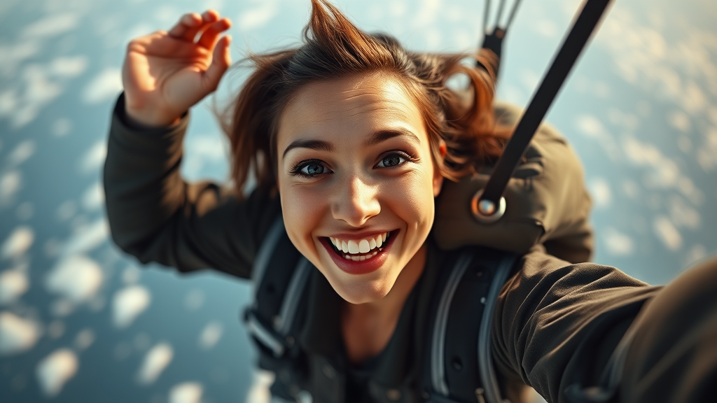 Young female skydiver capturing a selfie as she leaps from an airplane, her face beaming with excitement. The image captures her full body in mid-air, showcasing her adventurous spirit. Her skin appears detailed and lifelike, with a focus on realism and high resolution—captured in 8k quality. The scene is bathed in diffused, soft lighting that creates a gentle glow, adding to the photo-realistic feel. The depth of field is shallow, ensuring a sharp focus on her expression and her surroundings, embodying hyperrealism. The cinematic lighting enhances the artistic palette while maintaining clarity and vibrance. No distracting elements like low-resolution effects, text disruptions, or distortions are present, ensuring a clean and elegant presentation. Her form is naturally proportioned, and the image conveys a sense of motion and exhilaration, framed perfectly to avoid any cropping or artistic flaws.