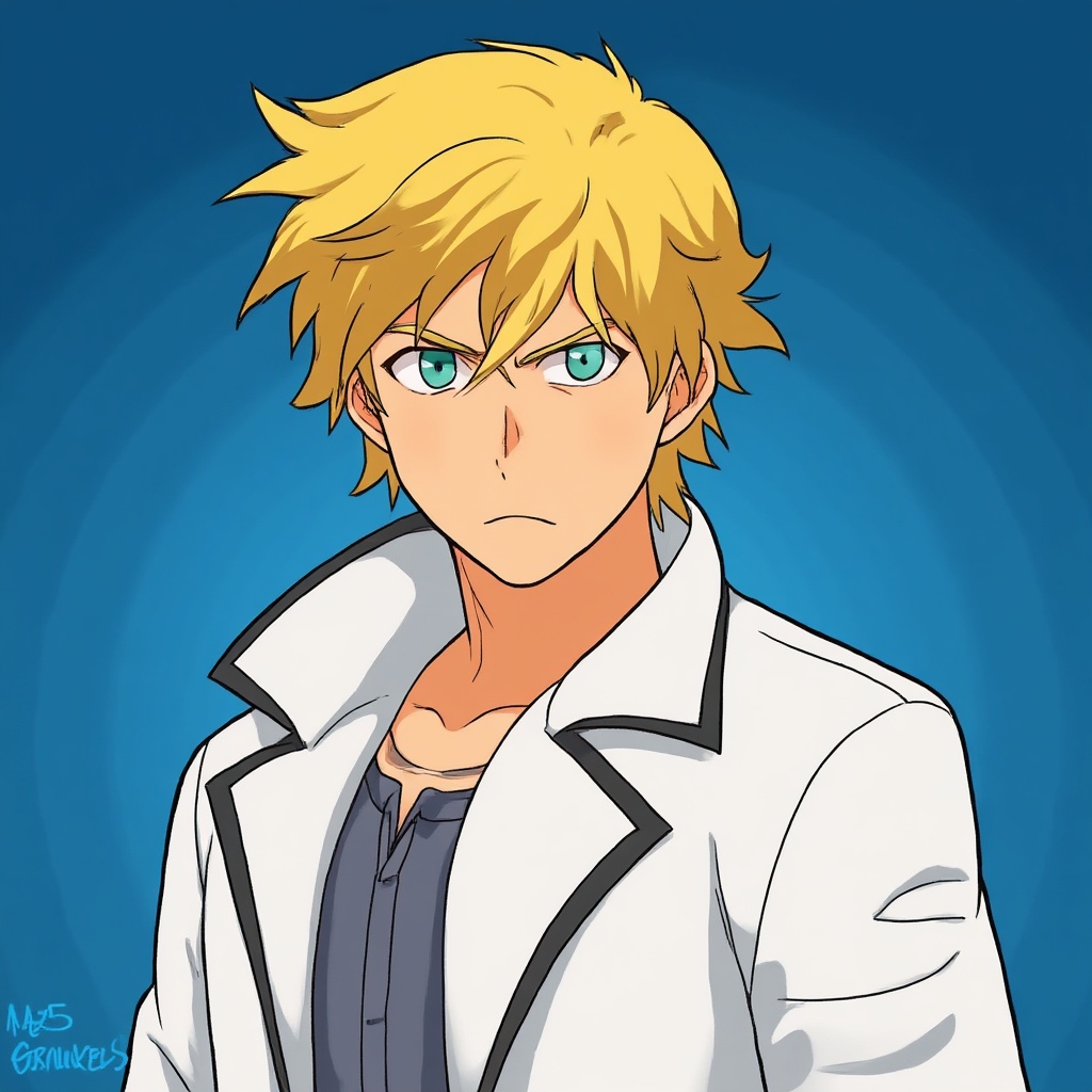 Young Fred from Scooby Doo, portrait style, wearing a sleek white jacket with blonde hair, exuding strength and confidence, sharp focus, digital art, central subject, imaginative concept art, enhanced through post-processing, vibrant and dynamic lighting, highly detailed, rendered with precision, subtle creative twists in presentation.