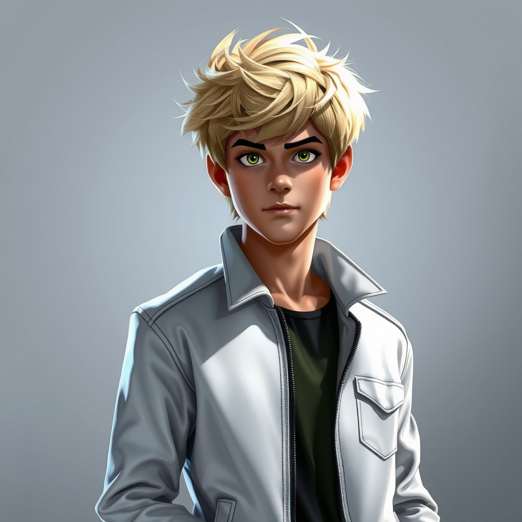 Young Fred from Scooby Doo in a sleek white jacket, tousled blonde hair, exuding confidence and strength, finely detailed digital art with a contemporary twist, single subject focus, concept art style, enhanced with dynamic shadow play and vibrant lighting, meticulously detailed rendering that brings out the texture and depth.