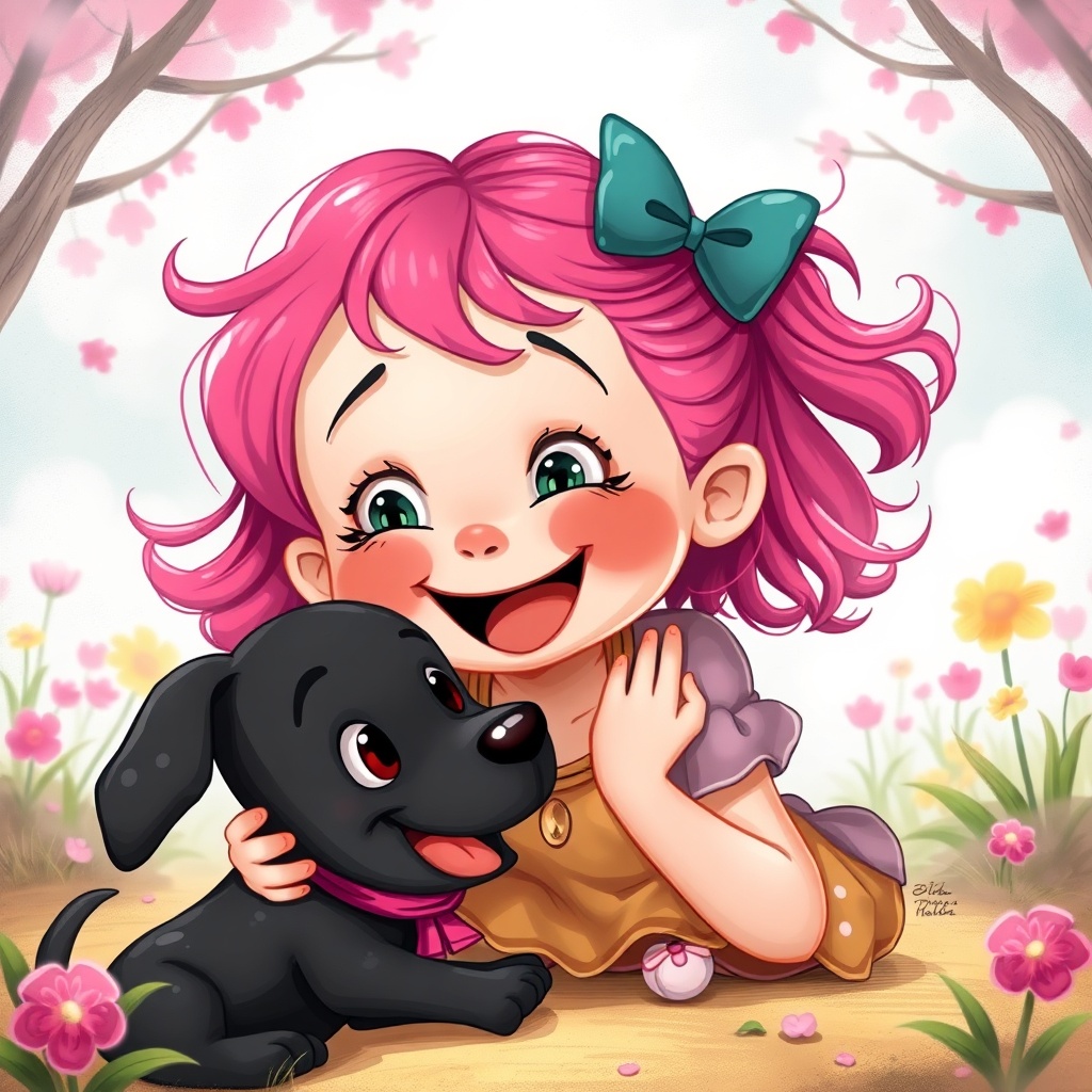 A cheerful young girl with vibrant pink hair playfully interacting with a mischievous black puppy, captured with a whimsical flair and lively expressions, inspired by the styles of Eve Ventrue, Patrick Brown, and Alain Laboile. The scene is filled with charming, cartoony characters, set against a dreamy background that enhances the playful and imaginative atmosphere.