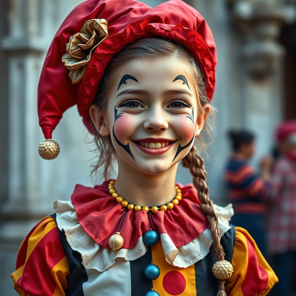 Young girl dressed as a harlequin, radiating happiness and charm with a bright smile, embodying the essence of cuteness at a Venetian carnival, depicted in full body, painted in high resolution hyper-realism, reminiscent of an oil painting by Frank Frazetta, with the addition of vibrant colors and intricate patterns enhancing her playful costume.