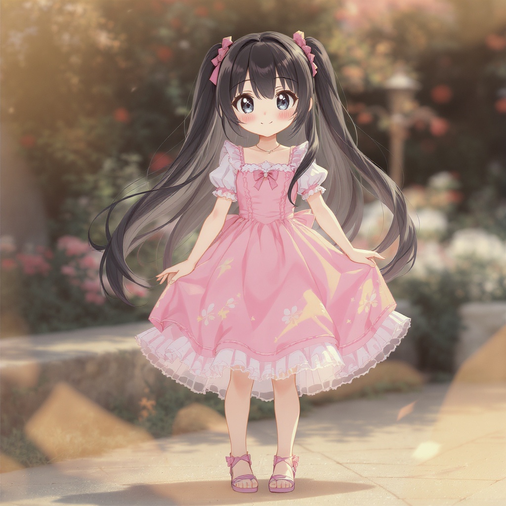 A charming young girl with large, expressive anime eyes and flowing raven hair stands playfully. She's adorned in a pastel pink dress adorned with delicate lace trimmings and soft ruffles, paired with strappy, whimsical sandals. Her gentle smile and the twinkle in her eyes capture a sense of wonder and adventure.
