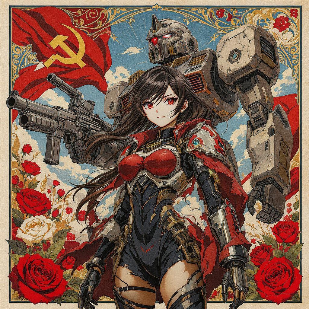 Young girl in a tattered futuristic suit styled like a Soviet-era poster, standing amidst a backdrop of guns and roses, with imposing mech figures towering behind her. The scene is set on a bright sunny day, capturing the essence of anime and manga graphics with a preference for dark, rich colors and the textured look of offset printing. The artwork brims with high detail, featuring intricate ornate designs. It embodies the illustrative flair of Johanna Rupprecht and the detailed patterns of William Morris, and it captures a scene that is both dynamic and nostalgic, as though it's trending on art platforms like ArtStation. The poster-like composition is detailed and vibrant, presented in ultra-high resolution, evoking the essence of a finely tuned, octane-rendered piece.