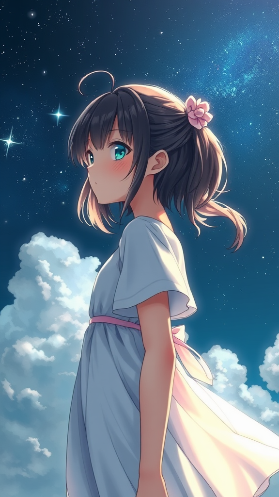 Young girl in airy attire, inspired by Oyari Ashito's style, standing against a starlit sky on a summer night, evoking feelings of serenity, purity, and dreamy wonder. Manga-inspired graphics capture her essence, showcasing a blend of anime drawing precision with contrasting dark shadows and vivid colors. The scene is depicted with the utmost attention to detail and quality, in a portrait view set against a backdrop of deep tones and soft clouds. The perspective is intimate, drawing the viewer into a tranquil, enchanting night.