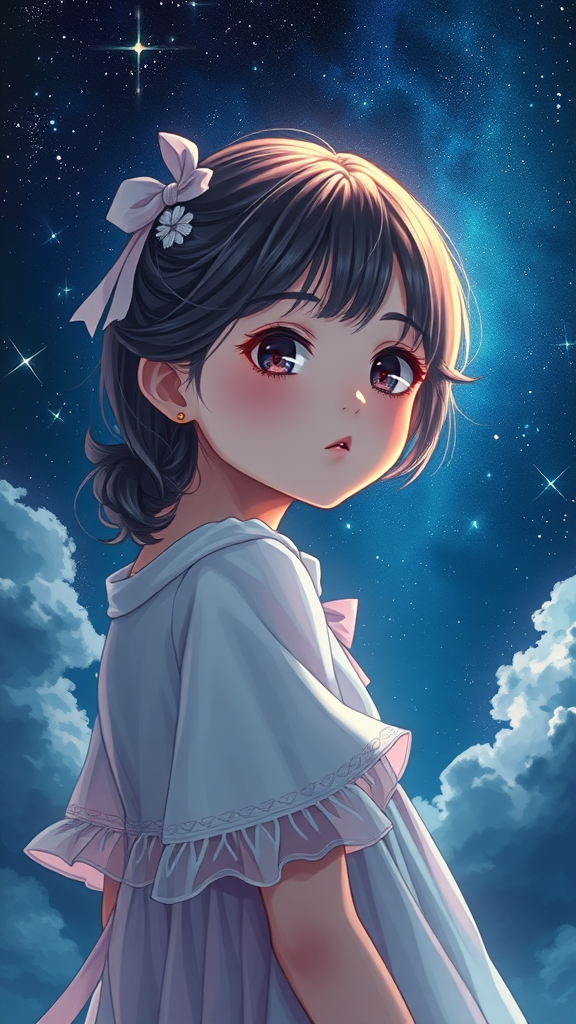 Young girl in delicate attire, inspired by Oyari Ashito's style, set against a starry summer night sky. The portrait evokes feelings of serenity and innocence, capturing a dreamlike essence with manga and anime influences. Features high detail and vibrant colors contrasting with dark, moody tones, viewed from a first-person perspective. Ethereal clouds add to the high-quality visual, embodying a sense of wonder and tranquility.
